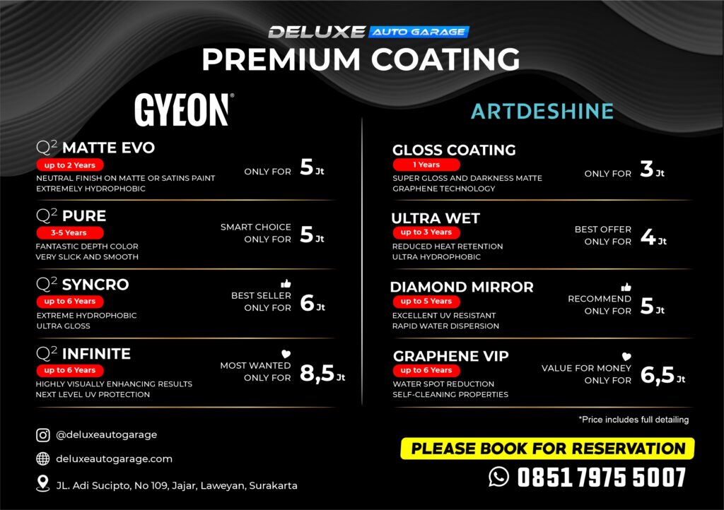 Proses coating mobil di Deluxe Auto Garage dilakukan oleh teknisi berpengalaman dengan menggunakan produk berkualitas tinggi. Setiap detail mobil akan diperhatikan dengan cermat untuk memastikan hasil yang sempurna. Coating kami memberikan perlindungan maksimal dan kilau yang luar biasa.
